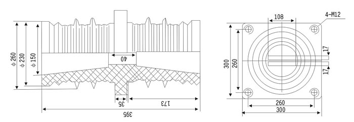 40.5KV穿墻套管為環(huán)氧樹脂APG工藝壓力凝膠成型結構,外形結構尺寸大小為128(100×100)mm、高225mm。主要適用于額定電壓為10KV及以下的成套設備中,作絕緣隔離和聯(lián)接過度之用。套管耐污及潮濕,無需特別維護,只需定期地清理表面污質。安裝時母排從孔內穿過。