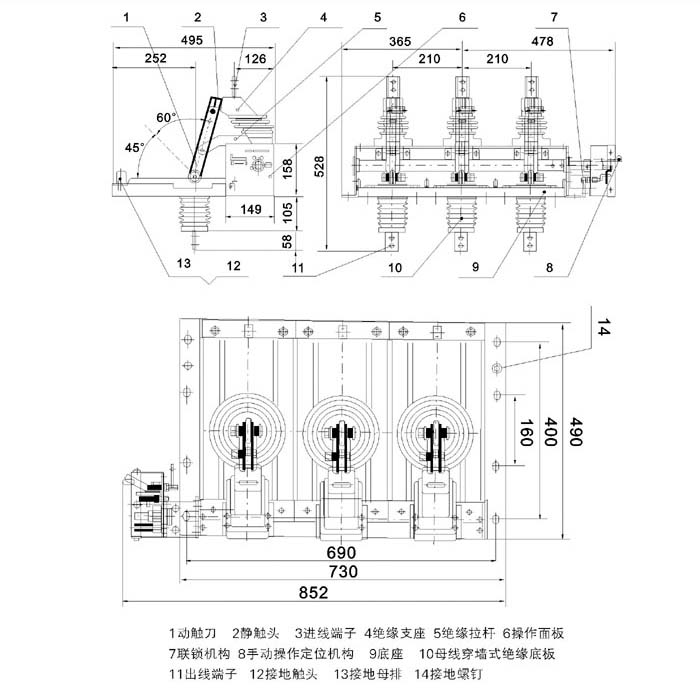 單斷點(diǎn),三工位結(jié)構(gòu)確保隔離開關(guān)合閘時(shí)不能接地,接地時(shí)不能合閘。